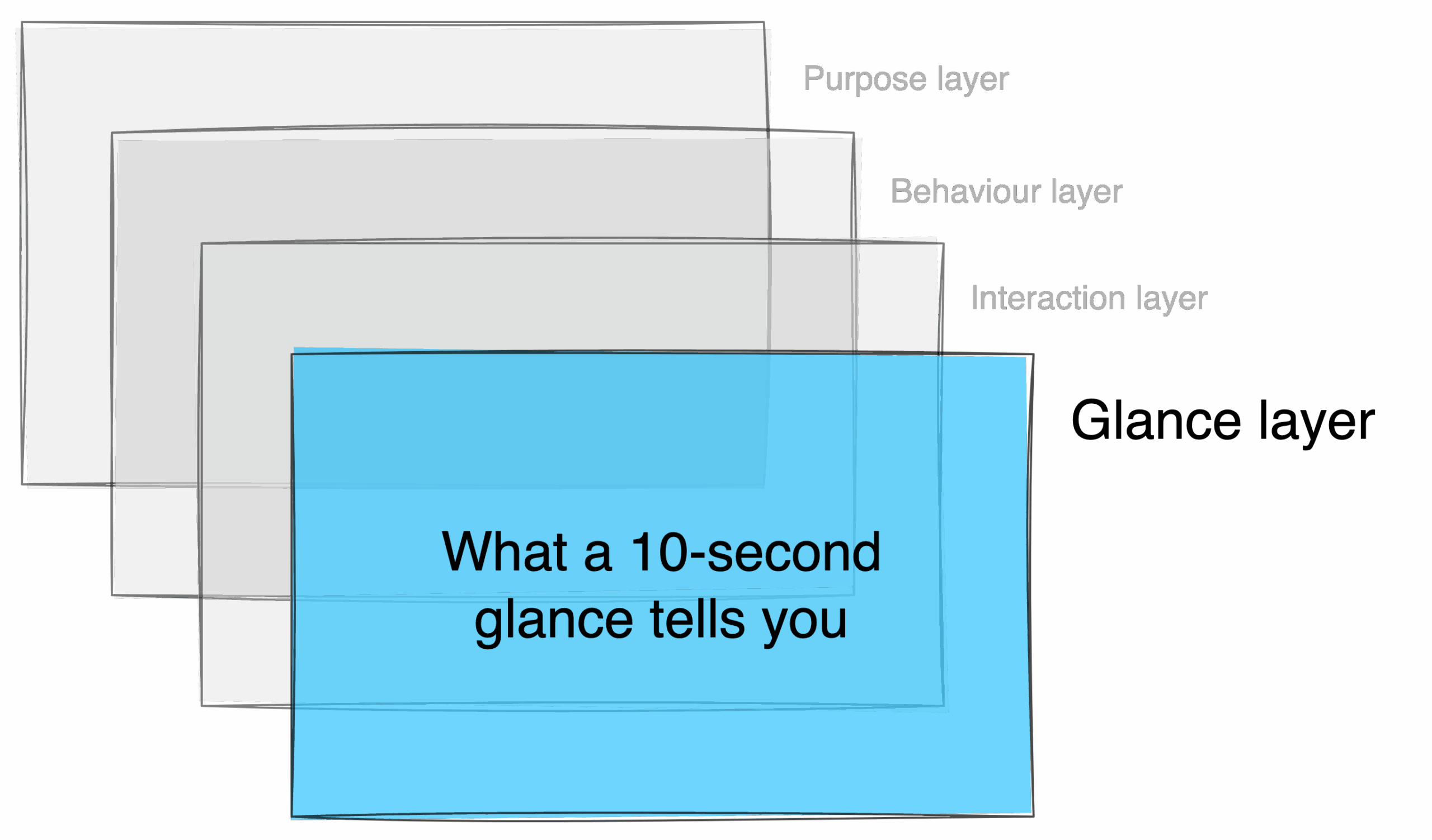 Within the glance layer, elements such as headings, microcopy, design language, colours, and overall visual coherence dictate how users perceive and interact with the product. Essentially, it encapsulates the look and feel of the user experience.