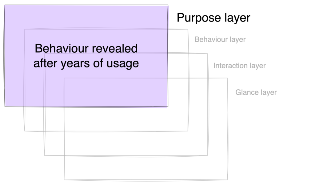The purpose layer is much more concealed and not evident until you have spent a significant amount of time with it. This is the layer where experience becomes integrated into the overarching goal of why a product or business exists and what it is intended to leave its consumers after a few years of use.