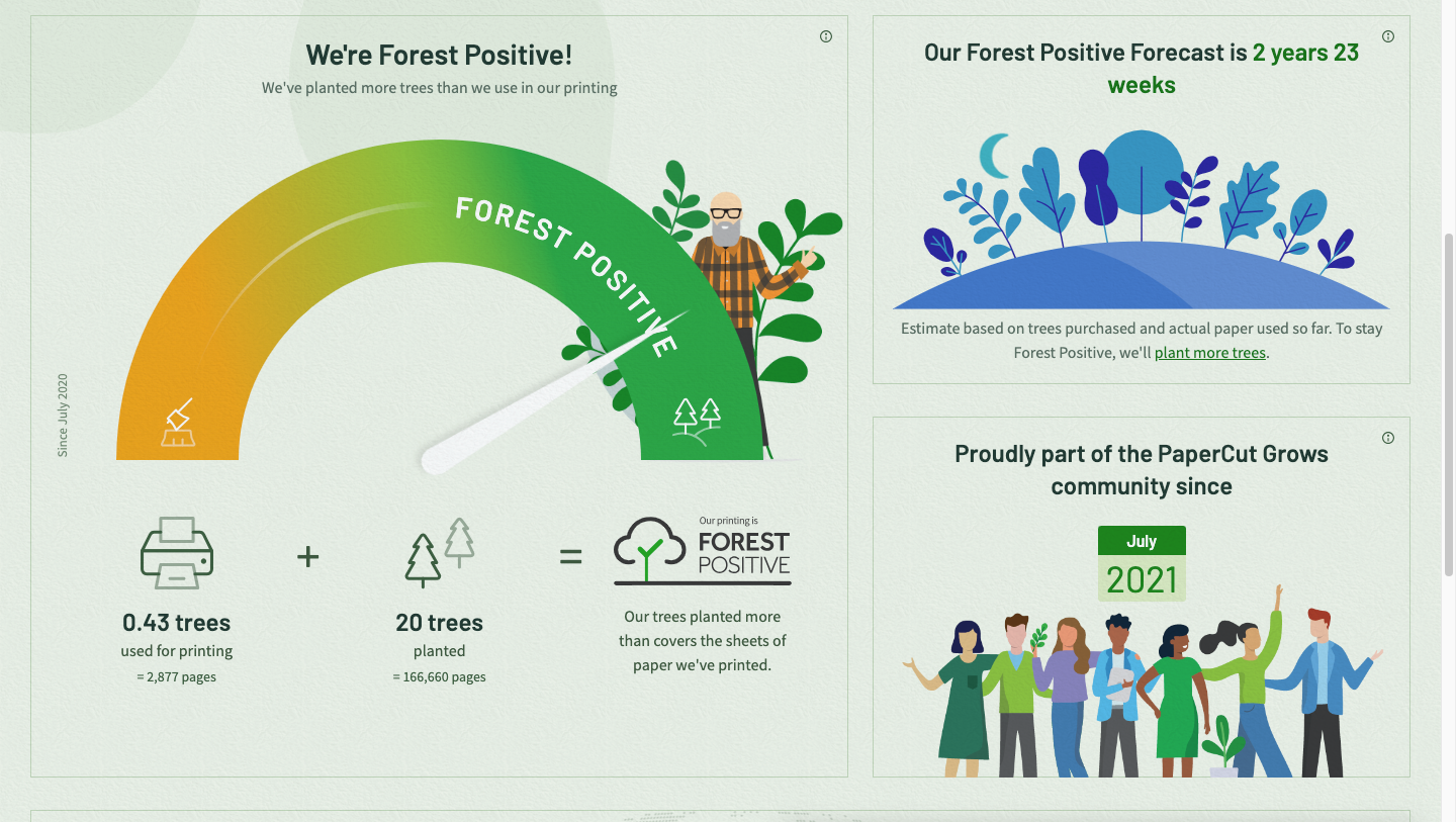 Dashboard displaying paper consumption and corresponding tree planting.